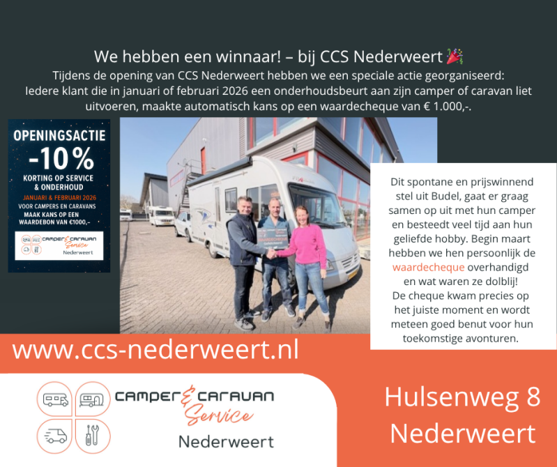 Iedere klant die in januari of februari 2026 een onderhoudsbeurt aan zijn camper of caravan liet uitvoeren, maakte automatisch kans op een waardecheque van € 1.000,-.
